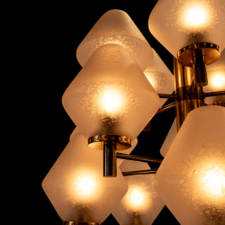 Golden and chromed brass chandelier with 15 arms of Murano glass lights frosted, complete restoration with high-end finishes.