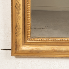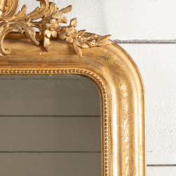 Gilded wooden mirror with small pediment, floral decorations, beautiful pearls, gilding, original mirror, wooden floor.