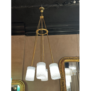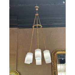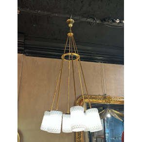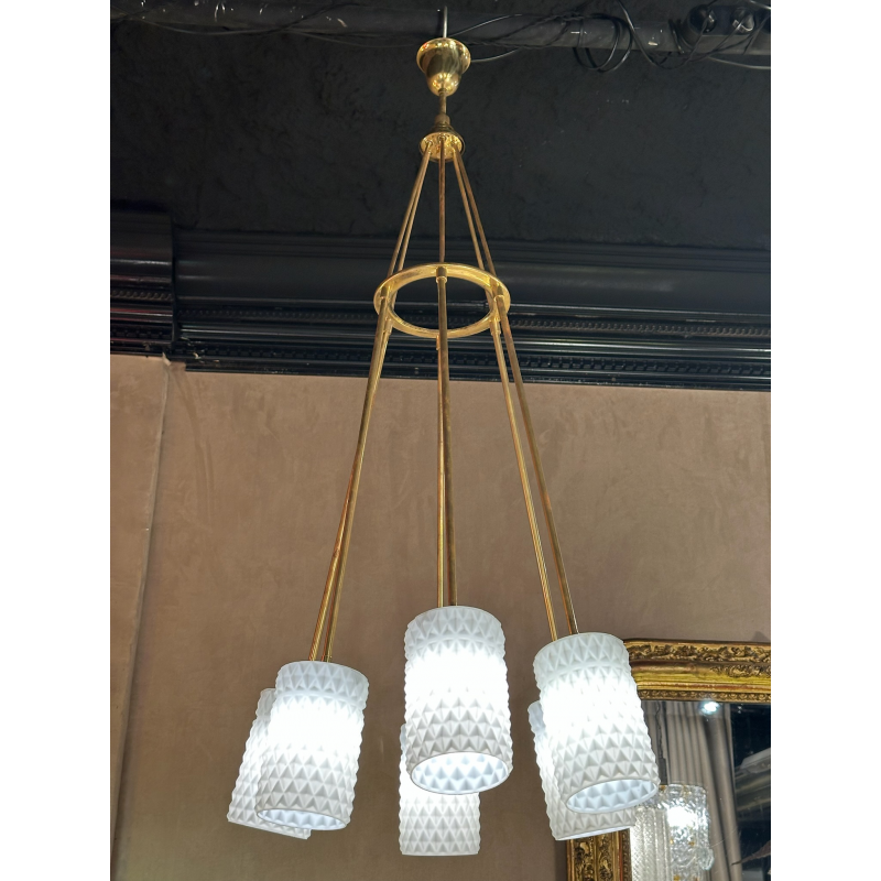 Elegant six-light chandelier in gilded brass and Murano glass, Italian design from the 1970s.