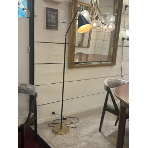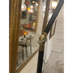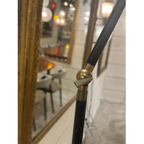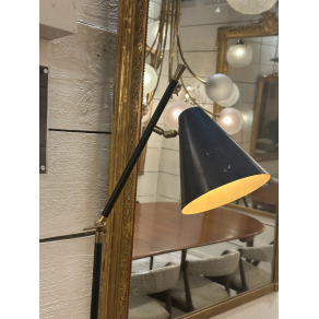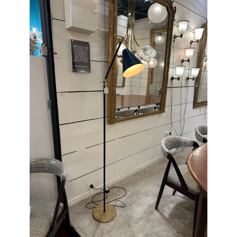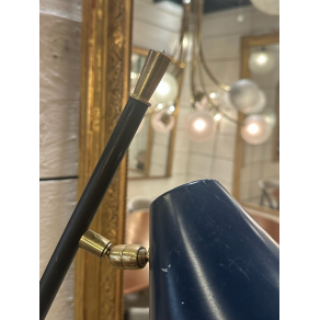 Stilnovo floor lamp in gold-plated brass, black lacquered steel, dark blue cone.