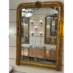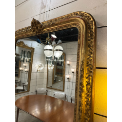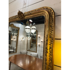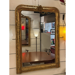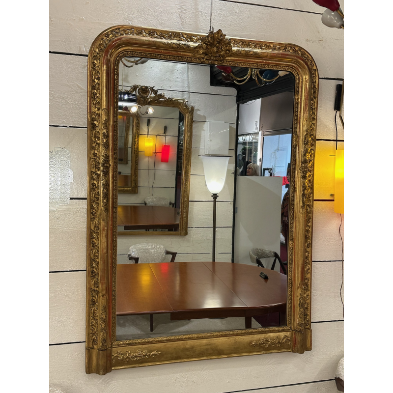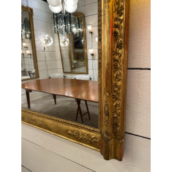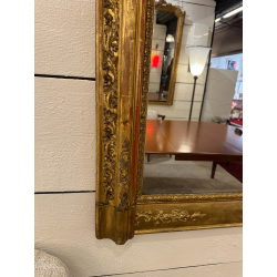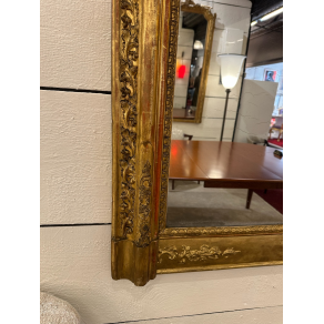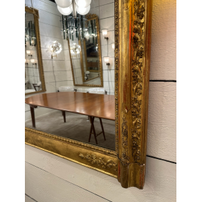 Miroir de cheminée en bois et stuc doré, belles décorations florales, dorure d’origine, glace ancienne, parquet bois.