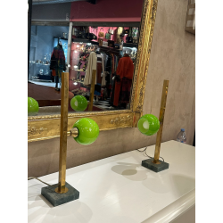 Paire de lampes en laiton doré, base en marbre, verre de Murano, de couleur vert clair, entièrement Restaurées et électrifiées