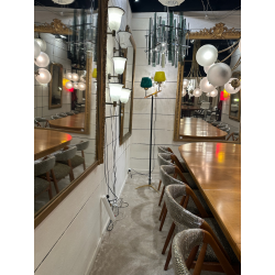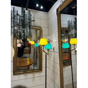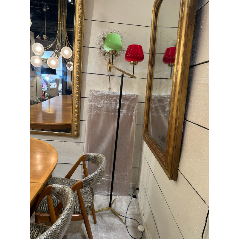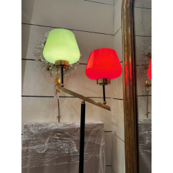 Paire de grands Lampadaires asymétriques en laiton, doré, métal, laqué, noir et très beaux verres de couleur.