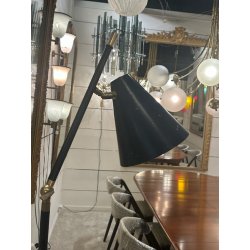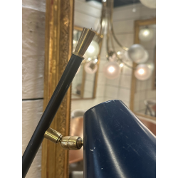 Lampadaire de Stilnovo en laiton doré, acier laqué noir, cone de couleur bleu foncé.